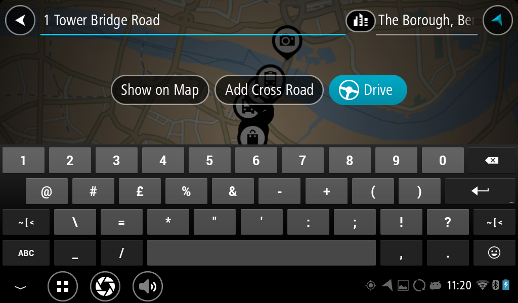 Приложението за навигация се стартира и се отваря екранът за търсене, при което се показва клавиатурата. Избраният текст се показва в горната част на екрана, а предложенията за търсене въз основа на избрания текст се показват в колони.