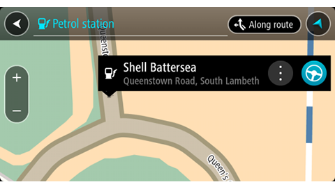 Wskazówka: korzystając z podręcznego menu, możesz dodać stację benzynową jako postój na swojej trasie. Stacja benzynowa będąca postojem na trasie jest oznaczona niebieską ikoną.