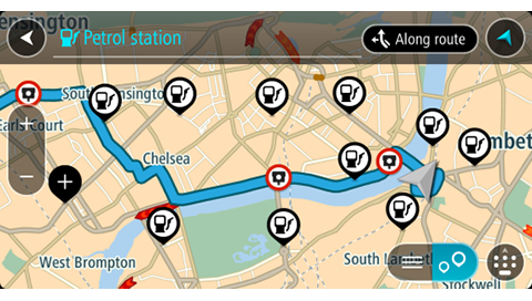 Jeśli zaplanowano trasę, na mapie wyświetlą się stacje benzynowe wzdłuż trasy. Jeśli nie zaplanowano trasy, na mapie wyświetlą się stacje benzynowe w pobliżu Twojej aktualnej pozycji.