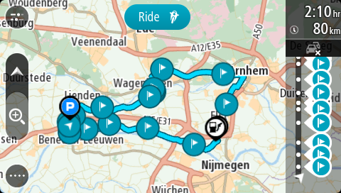 Punkt początkowy trasy zostanie przekształcony w pierwszy postój, a trasa zostanie zaplanowana od aktualnej pozycji. Zostaną uruchomione wskazówki nawigacyjne. Po rozpoczęciu jazdy automatycznie wyświetli się widok nawigacji.