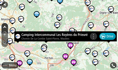 Освен това можете да изберете обект (POI) за къмпинг на картата за бързо планиране на маршрут: