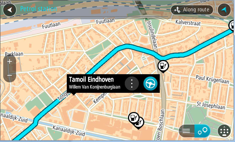 Wskazówka: korzystając z podręcznego menu, możesz dodać stację benzynową jako postój na swojej trasie. Stacja benzynowa będąca postojem na trasie jest oznaczona niebieską ikoną.