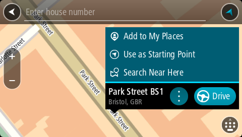 Po wybraniu adresu z listy wyników wyszukiwania możesz wyświetlić go na mapie, dodać skrzyżowanie lub zaplanować trasę do tej pozycji. Aby uzyskać dokładny adres, można podać numer domu.