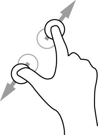 Kosketa näyttöä peukalolla ja toisella sormella. Sormien liikuttaminen pois päin toisistaan lähentää ja niiden liikuttaminen toisiaan kohti loitontaa. Käyttöesimerkki: kartan zoomaaminen. Vihje: Zoomaus nipistämällä ei ole saatavilla kaikissa laitteissa. Jos zoomaus nipistämällä ei ole käytettävissä navigaattorissasi, käytä lähentämiseen ja loitontamiseen zoomauspainikkeita. |