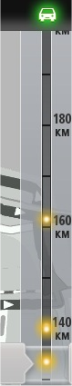 L'icona dell'automobile nella barra laterale Traffico visualizza il ritardo totale determinato dai problemi di traffico sul percorso. La sezione centrale della barra laterale Traffico mostra i singoli ingorghi nell'ordine in cui si verificano sul percorso. La parte inferiore della barra laterale Traffico rappresenta la posizione corrente. Scorrere la barra laterale Traffico con il dito, per visualizzare tutti i problemi di traffico sul percorso. Durante lo scorrimento, la barra laterale Traffico si arresta quando raggiunge il problema successivo. Per migliorare la visibilità sulla barra laterale Traffico, è possibile che alcuni problemi di minore entità non vengano visualizzati. |