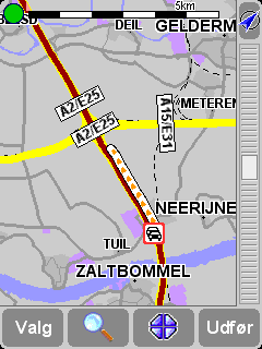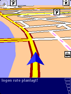Når programmet startes, vises navigationsvisningen. Skærmen viser et sort-hvidt billede, indtil GPS-modtageren registrerer din aktuelle position. Når det er gjort, skifter navigationsvisningen til farver. Fremover registreres din position meget hurtigere; normalt indenfor nogle få sekunder. Du kan let udføre alle funktioner med en enkelt finger. Du kan få vist hovedmenuen ved at trykke let med fingeren et vilkårligt sted midt på skærmen eller ved at trykke på joysticket.