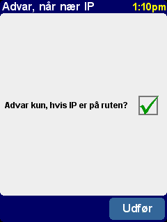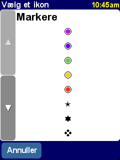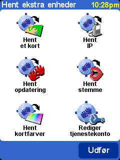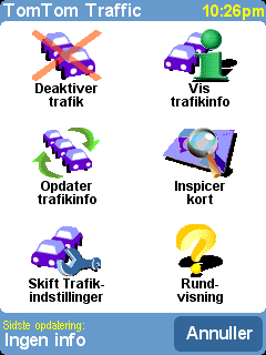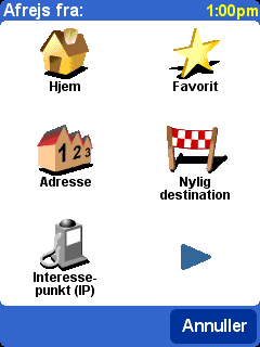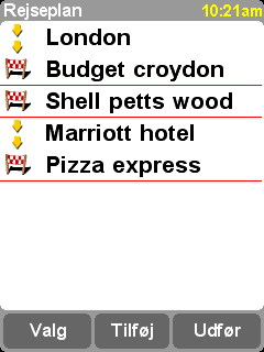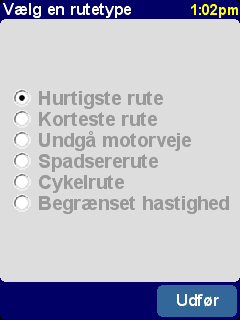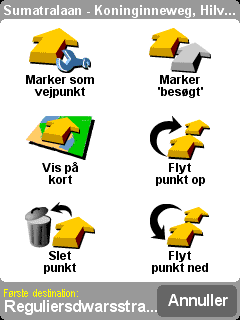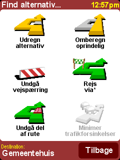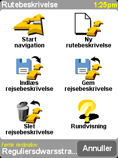 Tip: Hvis nogle af ikonerne er 'nedtonede', angiver det blot, at disse menuer endnu ikke er tilgængelige. Eksempel: Da du endnu ikke har planlagt en rute, er menupunkterne 'Find alternativ...', 'Vis rute' og 'Slet rute' alle nedtonede.