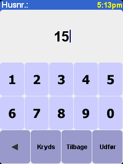 6. Der vises et tredje og sidste tastatur og browser. Denne gang for at du kan vælge et husnummer. Til nogle gader (fx. dem, der ikke har husnumre) vil du blive bedt om at vælge et bestemt 'Kryds:' (dvs. et vejkryds). Vælg et kryds, eller indtast husnummeret, og vælg derefter 'Gennemført'.
