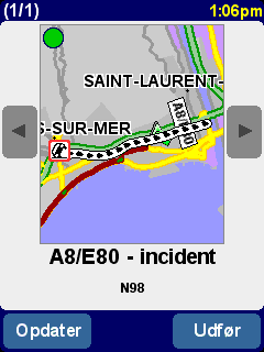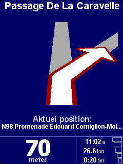 Så er planlægningen overstået, og du kan tage sikkerhedsselen på og sætte i gang. Når du nærmer dig et bestemt sving på den beregnede rute, fortæller den stemme, du har valgt, hvad du skal gøre. Eksempel: "Drej til venstre om 100 meter" efterfulgt af "Drej til venstre". Du behøver slet ikke fjerne blikket fra vejen. Mens du kører og følger de talte instruktioner, vil du opdage, at navigationsvisningen konstant opdateres og hele tiden viser vejene og krydsene forude. Desuden angives den bedste rute.