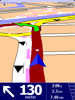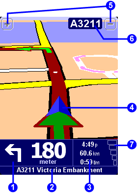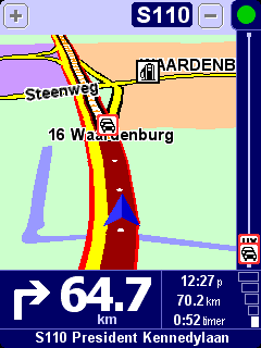 8. Vælg 'Gennemført', hvorefter du igen får vist hovednavigationsvisningen, men denne gang er ruten tydeligt markeret med farver. Når du nærmer dig et bestemt sving på den beregnede rute, fortæller den stemme, du har valgt, hvad du skal gøre. Eksempel: "Drej til venstre om 100 meter" efterfulgt af "Drej til venstre". Mens du kører og følger de talte instruktioner, vil du opdage, at navigationsvisningen konstant opdateres og hele tiden viser vejene og krydsene forude. Desuden angives den bedste rute.