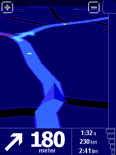 1. Bevæg dig udenfor, hvis du ikke allerede har gjort dette, så GPS-hardwaren kan registrere din position. Det kan tage lidt tid og sker hurtigere, hvis du bliver på det samme sted. Skærmen viser din aktuelle position på kortet i '3D'-navigationsvisning fra førerens perspektiv. Når du sætter dig i bevægelse, afspejler navigationsvisningen gaderne udenfor, som du ville se dem gennem bilens forrude.