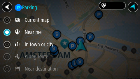 Pokud je naplánována trasa, zobrazují se na mapě parkoviště blízko vašeho cíle. Pokud trasa není naplánována, zobrazují se na mapě parkoviště blízko vaší aktuální polohy.