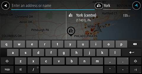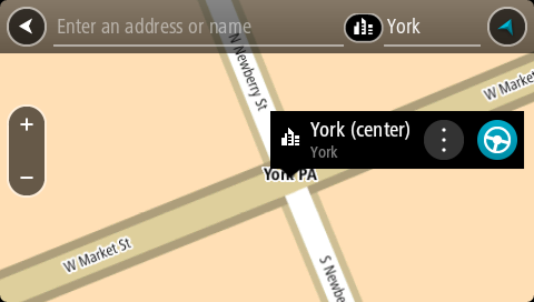 O nome da cidade é exibido à direita da caixa de entrada de pesquisa, e o PI do centro da cidade é exibido abaixo da coluna direita.