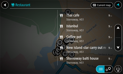 Tips: Du kan bytte mellom å se resultatene på kartet eller i en liste ved å velge liste/kart-knappen:
