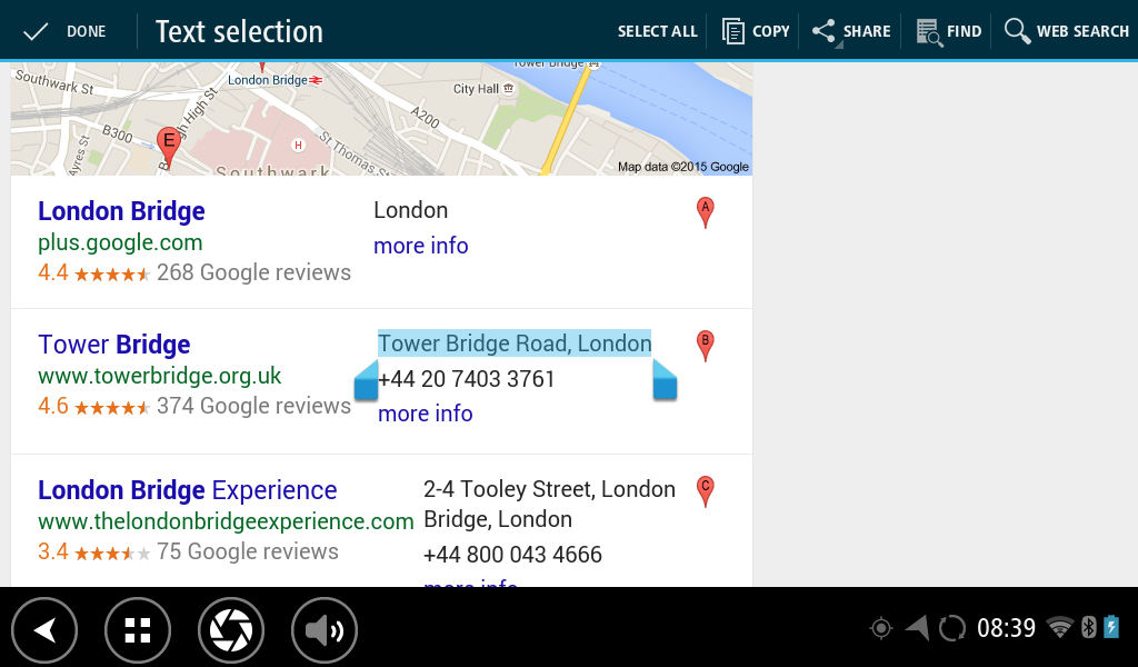 Du kan søke på Internett med Bridge-nettleseren og deretter velge tekst blant søkeresultatene for å dele den med TomTom Navigasjons-appen. Gjør følgende for å planlegge en rute ved hjelp av nettleseren: