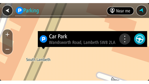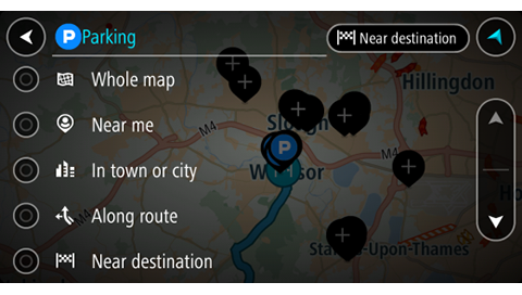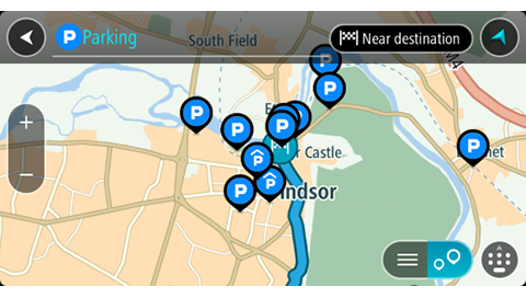 Εάν έχει σχεδιαστεί μια διαδρομή, στο χάρτη εμφανίζονται τα πάρκινγκ κοντά στον προορισμό σας. Εάν δεν έχει σχεδιαστεί μια διαδρομή, στο χάρτη εμφανίζονται τα πάρκινγκ κοντά στην τρέχουσα τοποθεσία σας.