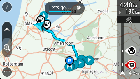 Reitin aloituspiste muunnetaan ensimmäiseksi pysähdykseksi, minkä jälkeen navigaattori suunnittelee reitin nykyisestä sijainnistasi. Opastus määränpäähän alkaa. Kun lähdet ajamaan, opastusnäkymä tulee näyttöön automaattisesti.