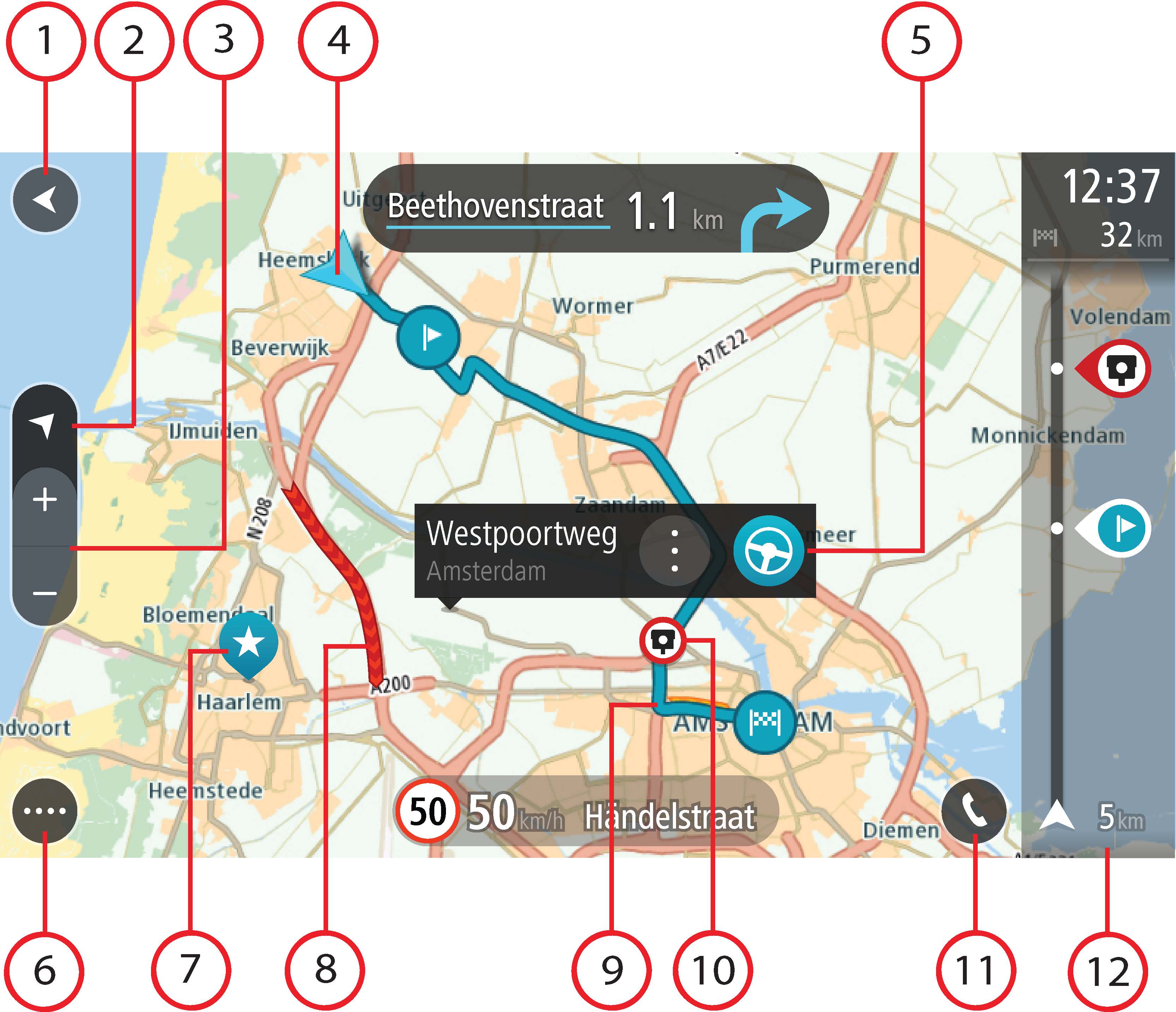 Jos olet suunnitellut reitin, se näkyy kartassa kokonaisuudessaan. Voit lisätä pysähdyksiä reitille lisäämällä niitä suoraan karttaan. Kun alat ajaa, näyttöön tulee opastusnäkymä.