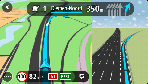 Pode optar por ver um ecrã dividido com a Vista de orientação à esquerda e a indicação de faixa à direita ou um ecrã completo com apenas a indicação de faixa. Também pode desativar a indicação de faixa. Aceda a Aspeto nas Definições para alterar a definição Pré-visualizações de saída de autoestrada.