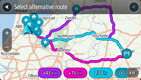 São mostrados até três percursos alternativos na Vista do mapa. Cada percurso alternativo apresenta num balão a diferença do tempo de viagem. Também pode selecionar o botão km/mi para visualizar a diferença como uma distância.