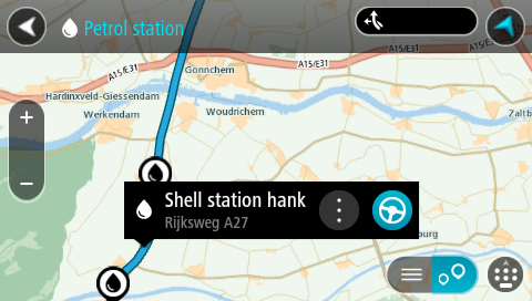 Nõuanne: võid bensiinijaama hüpikmenüü abil marsruudile peatuseks lisada. Bensiinijaam, mis on sinu marsruudil peatus, on märgitud sinise ikooniga.