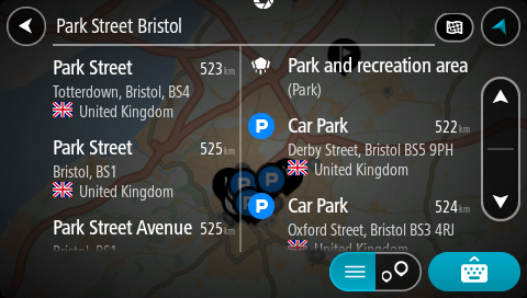 Aadresse ja linnade nimetusi kuvatakse vasakus tulbas, HP-sid, HP-de tüüpe ja kohti kuvatakse paremas tulbas. Otsingutulemustes näidatakse ka viimaseid sihtkohti ja salvestatud kohti.