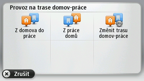 Tlačítka Z domova do práce nebo Z práce domů v nabídce Provoz na trase domov-práce vám umožní zkontrolovat cestu z a do práce stisknutím jediného tlačítka.