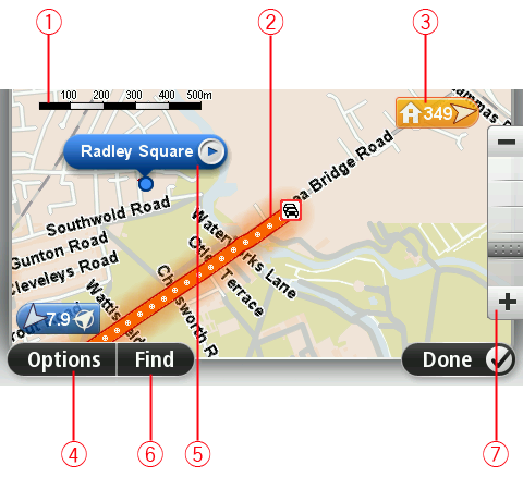 Tryk let på knappen i ballonen med gadenavnet for at åbne markørmenuen. Du kan navigere til markørens position, oprette en favorit for markørens position eller finde et Interessepunkt i nærheden af markørens position.