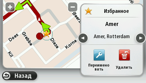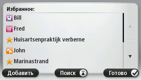 Нажмите эту кнопку, чтобы добавить, переименовать или удалить элемент Избранного. Категория "Избранное" обеспечивает простой способ выбора пункта следования без необходимости ввода адреса. Это не обязательно любимые места, их можно рассматривать просто как группу полезных адресов. Для создания нового элемента Избранного нажмите Добавить. Затем введите адрес пункта так же, как вы вводите его при планировании маршрута.