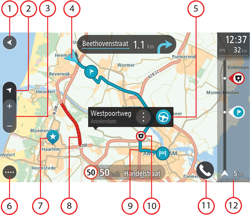 Radares de trânsito ou zonas de perigo no seu percurso. Selecione o símbolo de radar de trânsito ou a zona de perigo para visualizar mais informações.