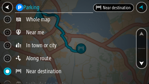 Hvis en rute er planlagt, viser kartet parkeringsplasser nær reisemålet ditt. Hvis en rute ikke er planlagt, viser kartet parkeringsplasser nær din gjeldende posisjon.