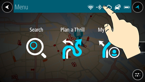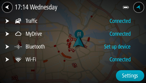 Du ser statusen for tjenestene dine, inkludert Traffic, MyDrive, Bluetooth og Wi-Fi.