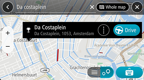 Když v seznamu výsledků vyberete adresu, můžete ji zobrazit na mapě, přidat křižovatku nebo do vybraného místa naplánovat trasu. Chcete-li najít přesnou adresu, můžete přidat číslo domu.