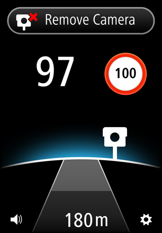 The distance to the camera counts down at the bottom of the screen as you approach. The Remove Camera button is shown so that you can remove the safety camera if it is no longer present on the road.