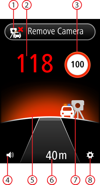 - Report or Remove Camera button. This area also shows your average speed when driving within average speed check zones.