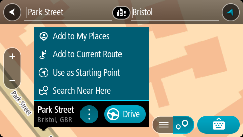 Če rezultat prikažete na zemljevidu, lahko s pojavnim menijem dodate lokacijo na seznam Moji kraji. Če je pot že načrtovana, lahko lokacijo dodate trenutni načrtovani poti.