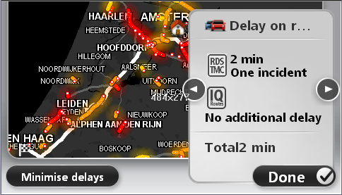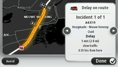 Tik op die knoppies vir die links- en regs-pyltjie sodat jy om die beurt deur elke insident kan beweeg en elkeen se details kan bekyk. Dit sluit in die soort insident, soos padwerke, en die duur van die vertraging wat die insident tot gevolg gaan hê.