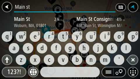 Remarque : la recherche s'effectue sur la totalité de la carte. Si vous souhaitez modifier la manière dont la recherche est effectuée, sélectionnez le bouton à droite de la zone de recherche. Vous pouvez alors modifier le lieu où la recherche est effectuée, par exemple le long du parcours ou dans une ville.